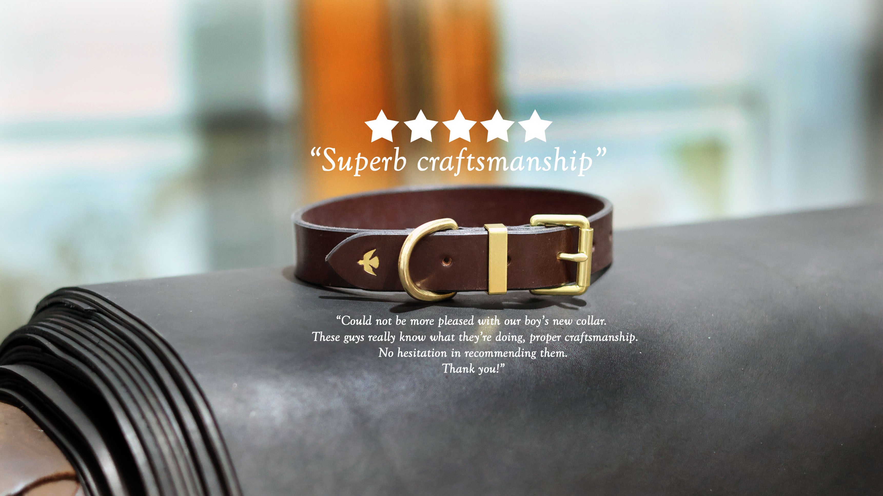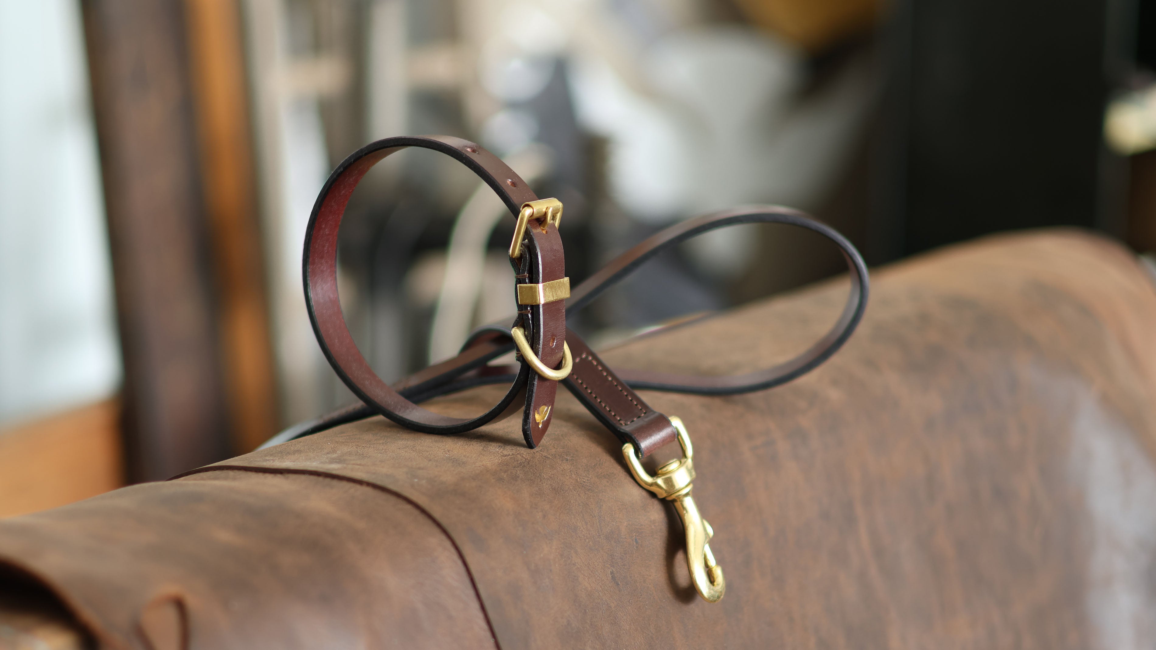 All of my dog collars and leads are made from the same English bridle leather I use for belts. They're cut, edged, and built by hand here in Lincolnshire. They're fitted with solid brass hardware and stitched to take whatever your dog throws at them.